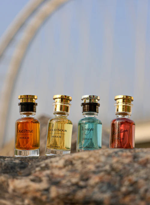 Miraje fragrances invite you into a world of unforgettable olfactory stories. From the crisp, invigorating zest ofVoyage to the warm, opulent mystery of Gold Souk, each scent is designed to stir the senses. Oud Privé delivers bold magnetism. Your next signature scent awaits—crafted to reflect your essence.